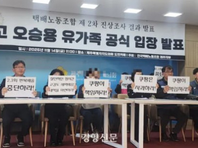 ※ 사진 설명: 전국택배노동조합 제주지부와 고 오승용씨 유족은 14일 오전 제주도의회 도민의 방에서 기자회견을 열고 쿠팡의 사과와 대책 마련을 촉구했다.(경향신문) 11월 10일, 제주에서 30대 쿠팡 택배기사가 새벽배송을 마치고 물류센터로 복귀하던 중 숨졌다. 이 노동자는 저녁 7시에 출근해 다음 날 아침 7시에 퇴근하는 12시간 야간 노동을…