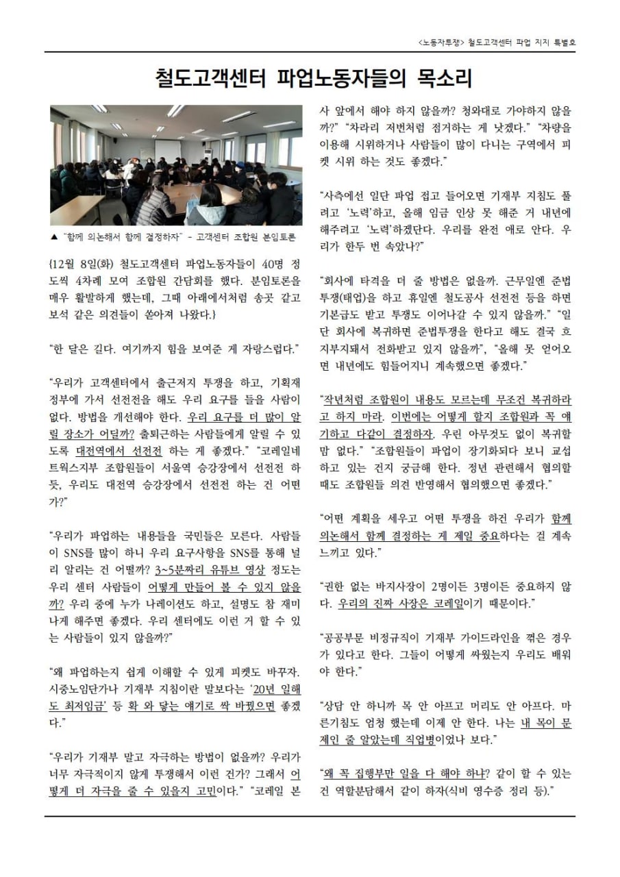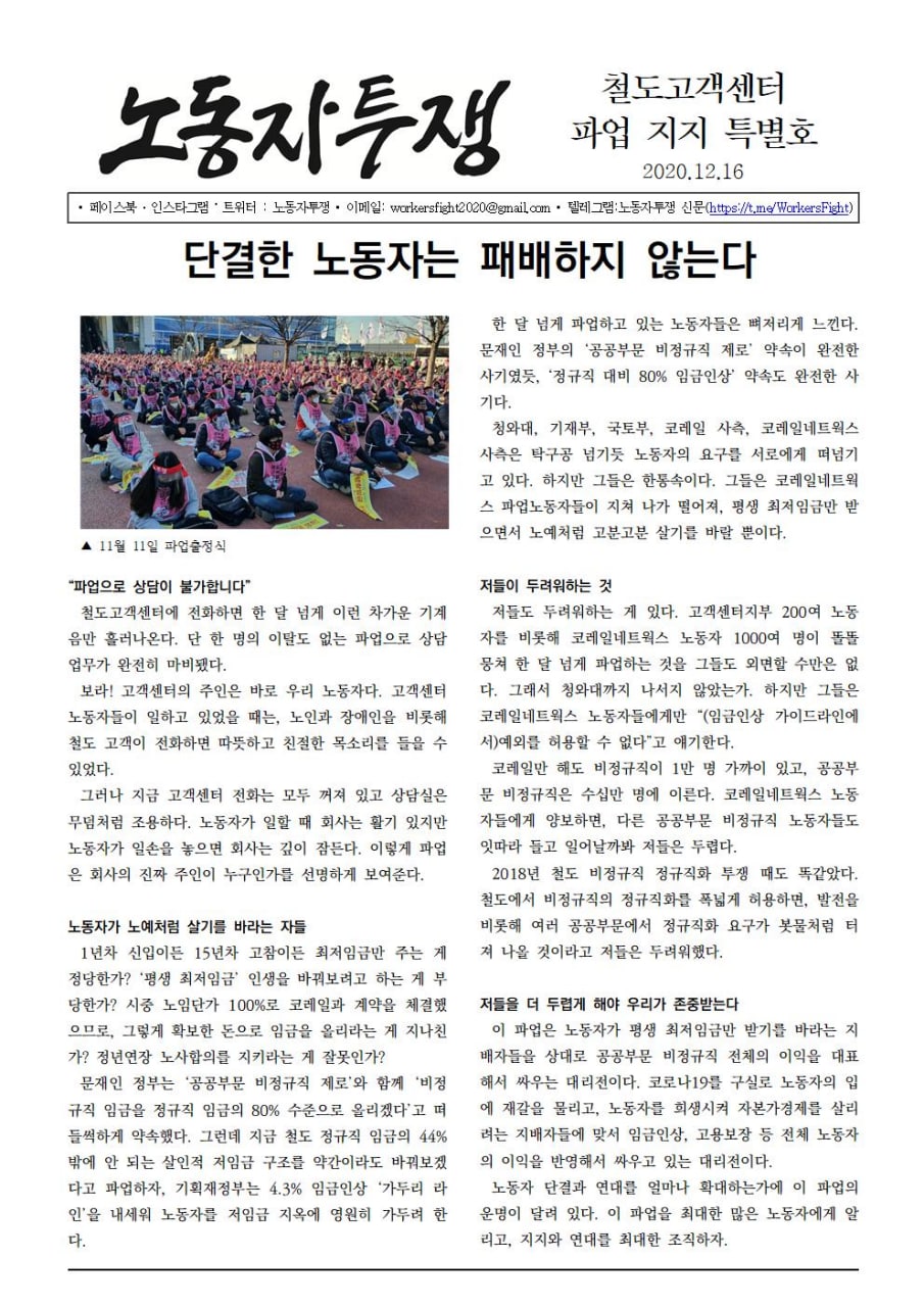 2020년 1216일에 나온 <노동자투쟁> 철도고객센터 파업 지지 특별호입니다.