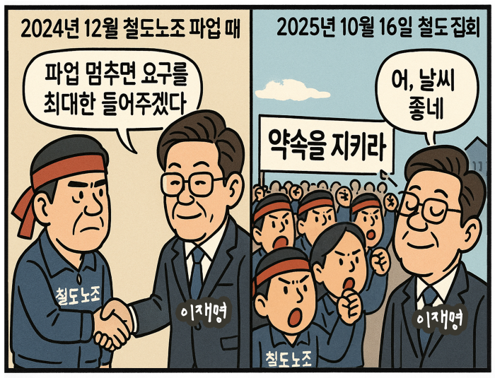 지난해 12월 철도노조 파업 당시, 이재명은 파업 중단을 요구하며 성과급 정상화, 고속철 통합을 약속했다. 대선 때 다시 고속철 통합으로 국민편의를 확대하고 안전성을 강화하겠다고 공약했다. 그러나 집권 130일이 지난 지금, 약속 이행 의지를 찾아볼 수 없다. 10월 16일 전국의 철도노동자들이 용산 대통령 집무실 앞에서 ‘약속을 지키라’고 외쳤지만, 예산, 임금, 인력 등 노동조건의 결정권을 틀어쥔 이재명 정부는 들은 척만 할 뿐이다. 우리 노동의 가치를 지키고, 정부에 책임을 물을 힘은 철도노동자 손에 달렸다.