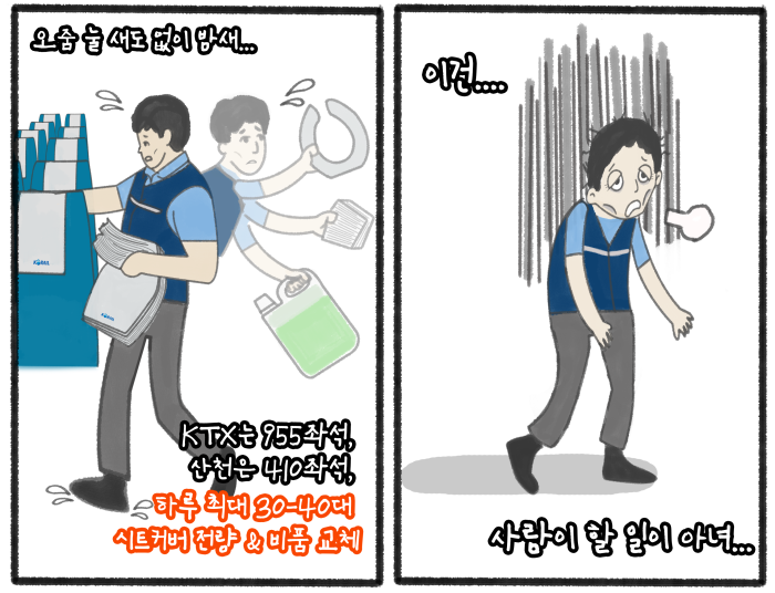 우리 비품관리 노동자는 3조 2교대로 일한다. 우리도 두 번째 야근이 힘들다. 첫 번째 야근 마치고 아침에 퇴근해 집에 가면 낮에 잠이 잘 안 온다. 잘 못 잔 상태에서 저녁 7시까지 출근해 밤새 계속 들어오는 열차들의 시트커버를 전량 교체하느라 발에 땀 나도록 일하고 나면 완전 비몽사몽이다.