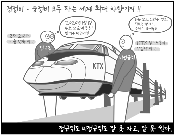 코레일은 KTX 고양차량기지가 세계 최대‧최첨단 시설이라고 엄청 홍보하지만 노동조건에 대해서는 침묵한다. 차량기지에서 KTX를 청소하는 노동자들은 저녁 7시부터 아침 8시까지 하루 13시간씩(무급 휴식 2시간 포함) 한 달 15일, 격일제 야근을 한다. 생체리듬이 깨져 낮에도 밤에도 제대로 못 잔다. 하루 이틀도 아니고 몇 년을 이렇게 일한다면 수명이 단축될 수밖에 없다!