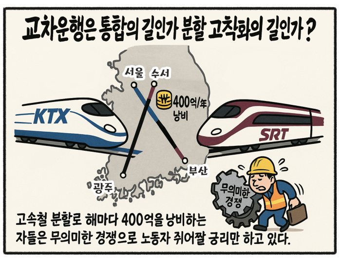 고속철 분할로 해마다 400억 넘게 낭비할지라도, 저들은 이런 허구적 경쟁구도로 노동자들을 최대한 쥐어짜고 철도노조를 무력화하고 싶을 것이다. 철도산업에 대한 통제권이 왜 철도의 진짜 주인인 노동자들이 아니라 책상머리에서 펜대나 굴리는 한줌 관료들에게 있어야 하는가?